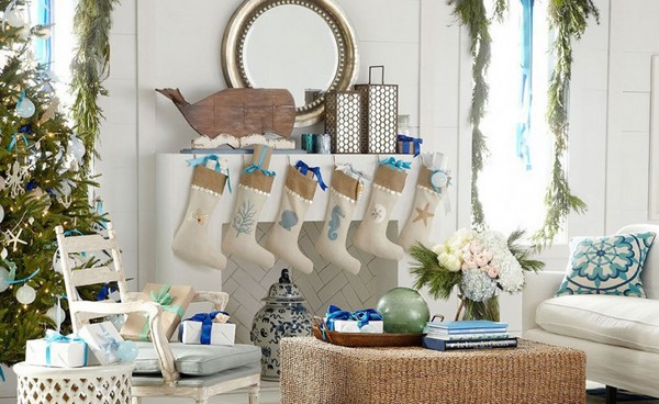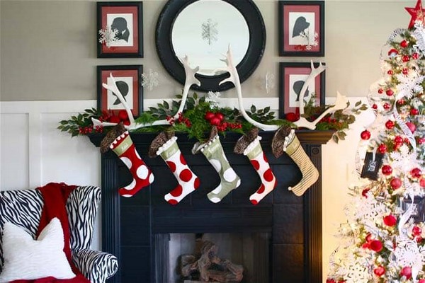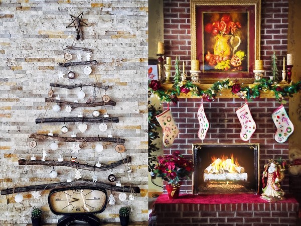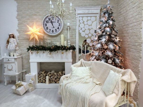 Il est également beau dans le style du Nouvel An que vous puissiez décorer les murs et la cheminée en utilisant les mêmes jouets, des cadeaux à suspendre et des décorations de Noël, des chaussettes, des guirlandes et des guirlandes du Père Noël.