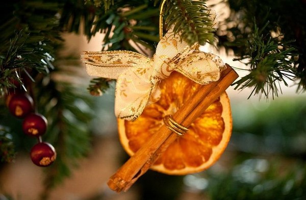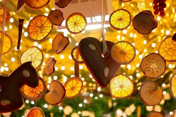 Des décorations inhabituelles pour le sapin de Noël 2026 peuvent être des oranges séchées, ainsi que des pâtisseries comestibles et diverses formes de biscuits.