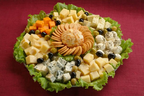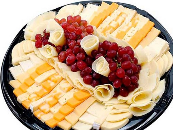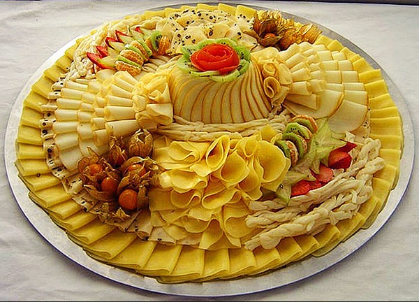 Le fromage peut être servi en cubes, en tranches, en tranches et de la manière que vous préférez. Les grandes tranches peuvent être torsadées, se présentant sous la forme de tranches de fromage sur une assiette sur les bords et placer de petits morceaux au centre.
