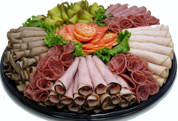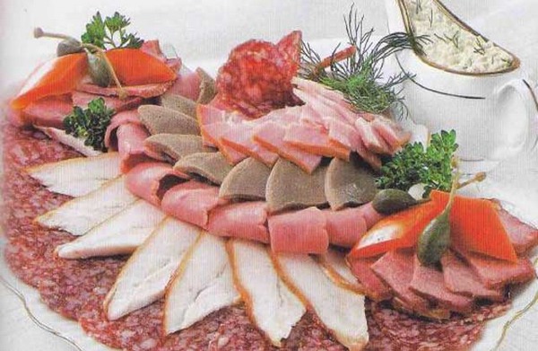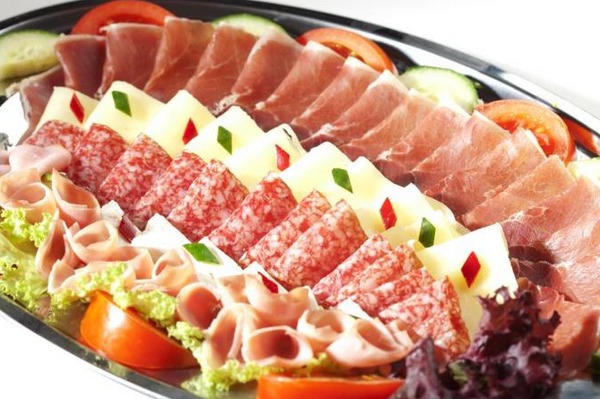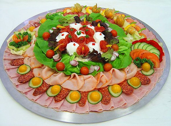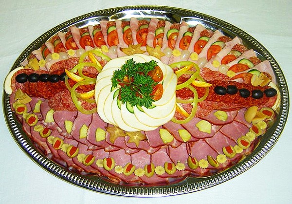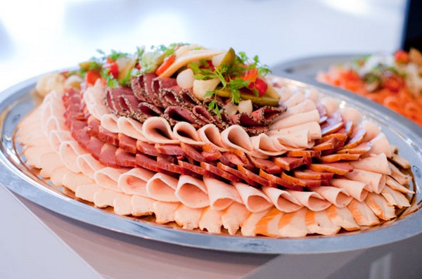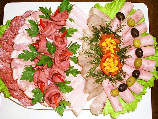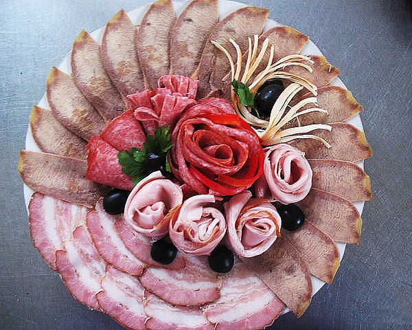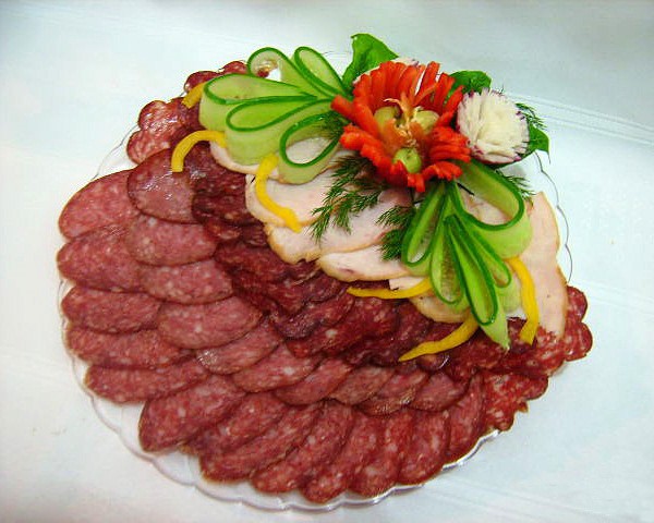 Après avoir sélectionné le bon type de plat, sur lequel dépendra la disposition de nos produits, ainsi que le type de tranchage final, vous pouvez commencer à couper la viande en tranches minces, ainsi que des saucisses.Si vous le souhaitez, les morceaux de viande peuvent être petits, mais de très gros morceaux peuvent être pliés ou roulés en rouleaux chaque morceau.