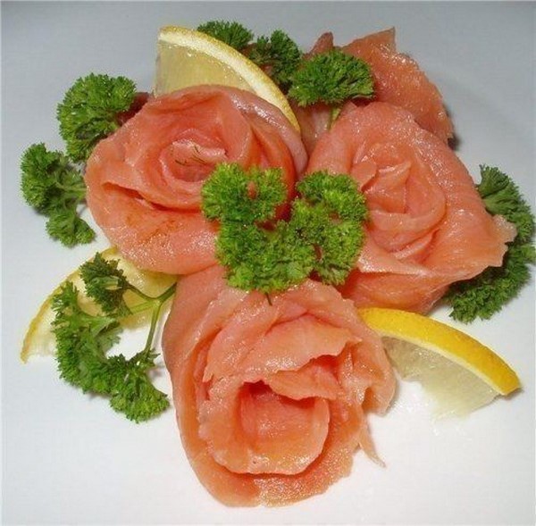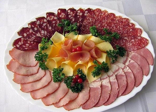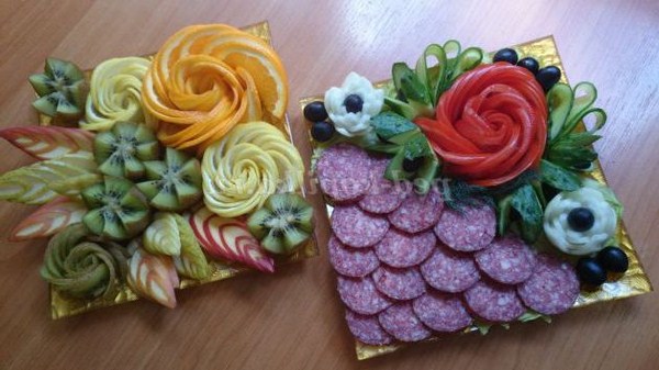Les coupes des fêtes ressemblent à des fleurs faites à partir de la même viande ou du même saucisson, des "rouleaux" et des boucles qui peuvent être tordues, ou en pliant les morceaux coupés et en les fixant avec des brochettes aussi jolies, qui décoreront la table avec des coupes de vacances inhabituelles.