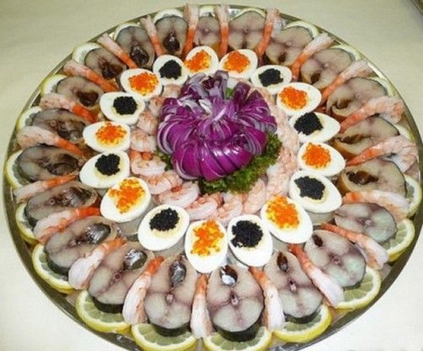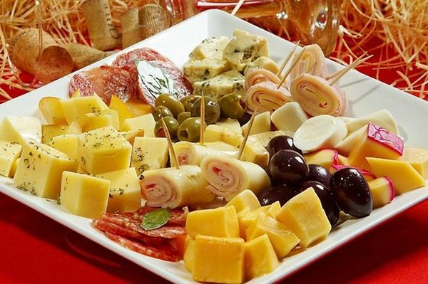 En pensant au menu, il vaut la peine d'inclure des coupes de viande et de saucisses festives, une assiette de fromage et des tranches de fromage, des collations de poisson, des légumes et des tranches de fruits qui devraient être présents sur la table de fête.