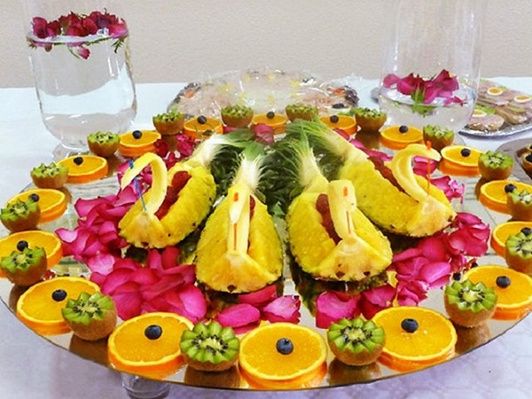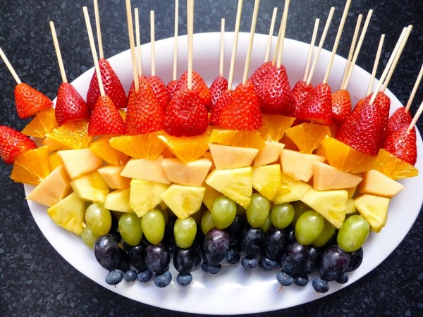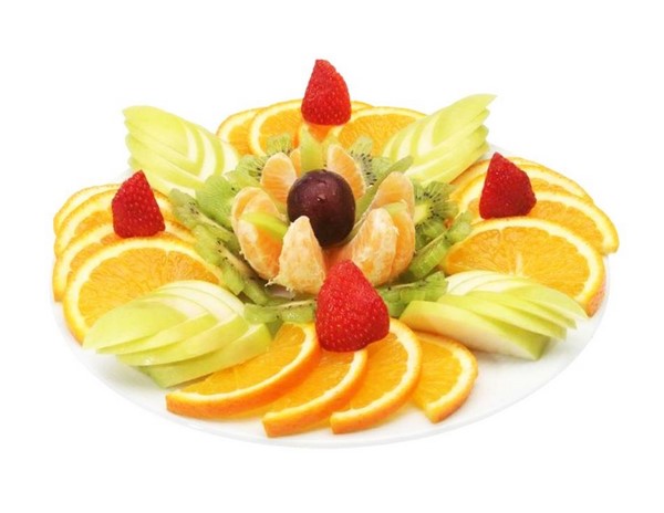 Les tranches de fruits festives comprennent une variété de fruits que vous ou vos invités adorent, mais il est préférable de choisir ceux de saison. Utilisez des combinaisons de fruits multicolores pour le tranchage, en organisant des tailles et des formes différentes, en effectuant une torsion ou une fixation à l'aide de brochettes. Et n'oubliez pas de découper les fruits, les paniers de fruits et les bouquets de fruits, qui seront achetés par vos invités!