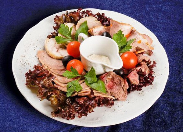 Sur des assiettes carrées, il est préférable de créer des tranches avec des secteurs à partir de types de viande ou de saucisses individuels, tandis que des rondes permettent aux niveaux de couper. Si vous le souhaitez, vous pouvez décorer avec des légumes, ajouter du fromage ou ajouter des verts pour la "luminosité" de la coupe.