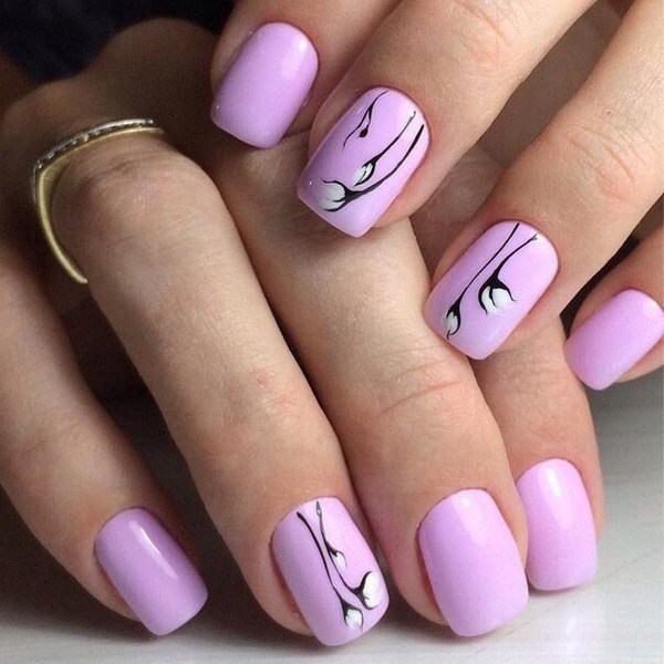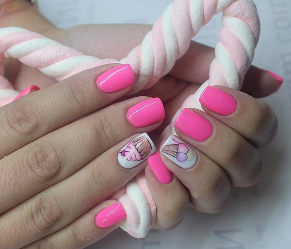 La manucure rose la plus en vogue 2025-2026 peut être facilement créée à l'aide de dessins et d'un dessin original sur les ongles. Les dessins et la conception des ongles peuvent être minimalistes - points, rayures, branches minces, personnages.