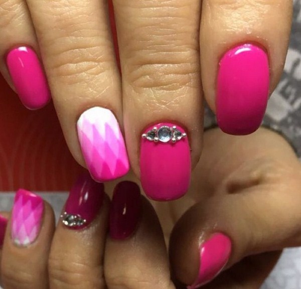Pour que la manucure rose ne semble pas ennuyeuse, les maîtres suggèrent d'utiliser différentes techniques pour créer une manucure rose vif à la mode 2025-2026. Créez une manucure rose vif en utilisant la technique de l'ombre, sculptant avec des paillettes, divers vernis, décorée avec des strass, des rayures, etc.