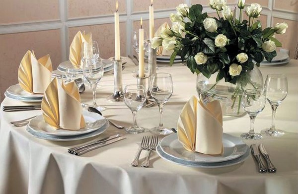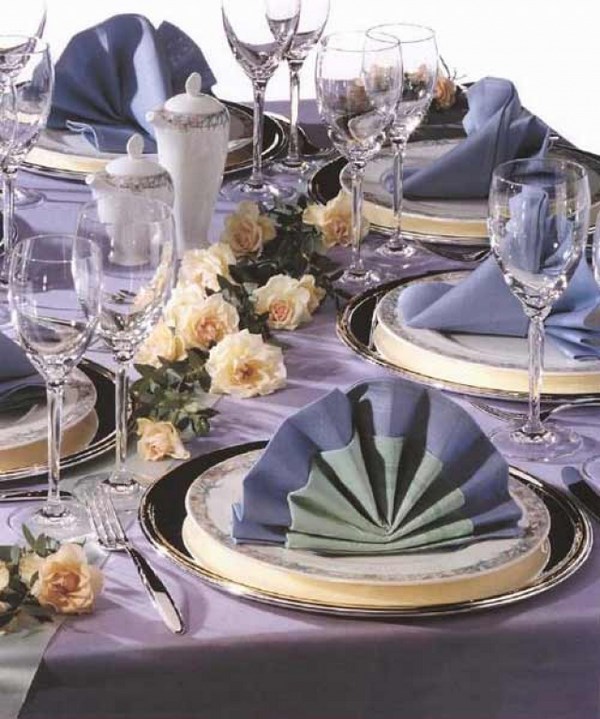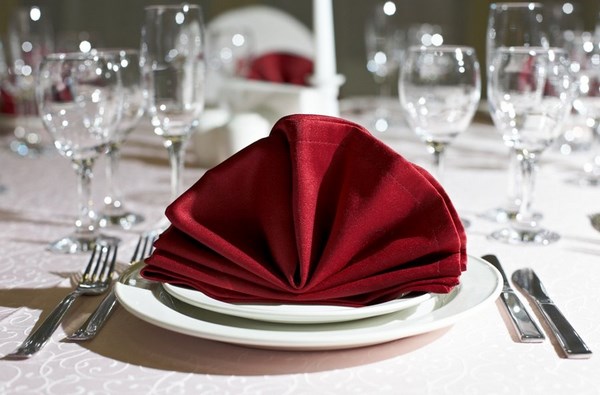La table de fête sert des serviettes joliment pliées de différentes manières, ce qui peut être considéré à juste titre comme une œuvre d’art. À partir de serviettes en papier, vous pouvez créer différentes figures, les plier magnifiquement et les attacher avec un ruban, ou simplement mettre une serviette sous une assiette ou dans un verre.