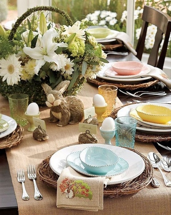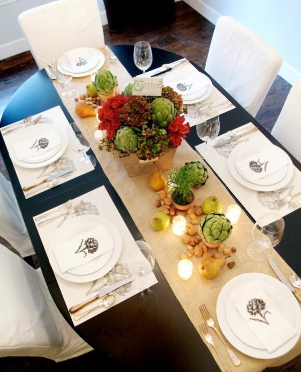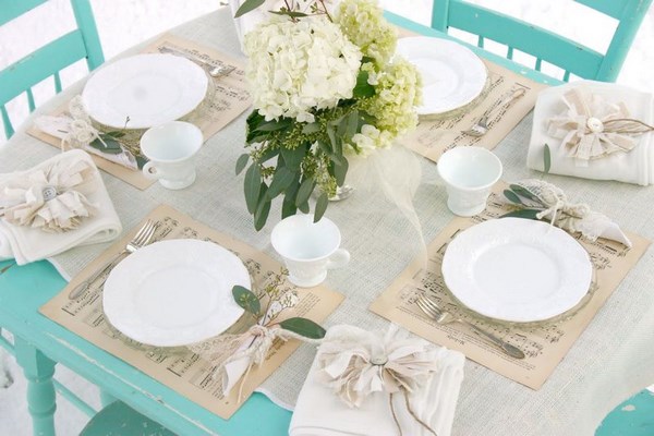 Un cadre de table exquis à la maison offre, pour les débutants, une sélection compétente de nappe pouvant être en blanc classique ou dans une couleur spécifique qui correspond au thème du jour férié - rouge, vert, turquoise, bleu, marron.