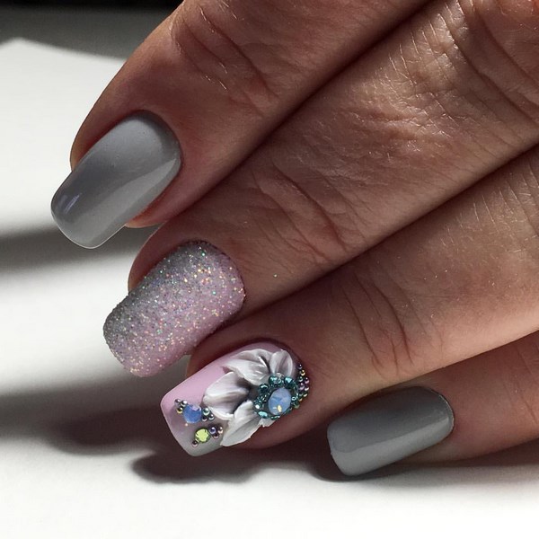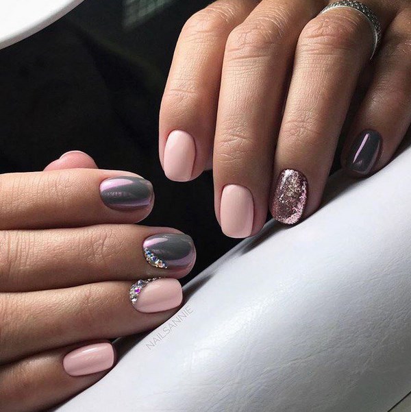 Pour une occasion spéciale, vous pouvez mettre en œuvre la manucure la plus chic gris-rose en utilisant plusieurs techniques à la fois, en complétant une manucure grise avec des galets et un décor, des frottements et des paillettes.