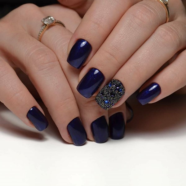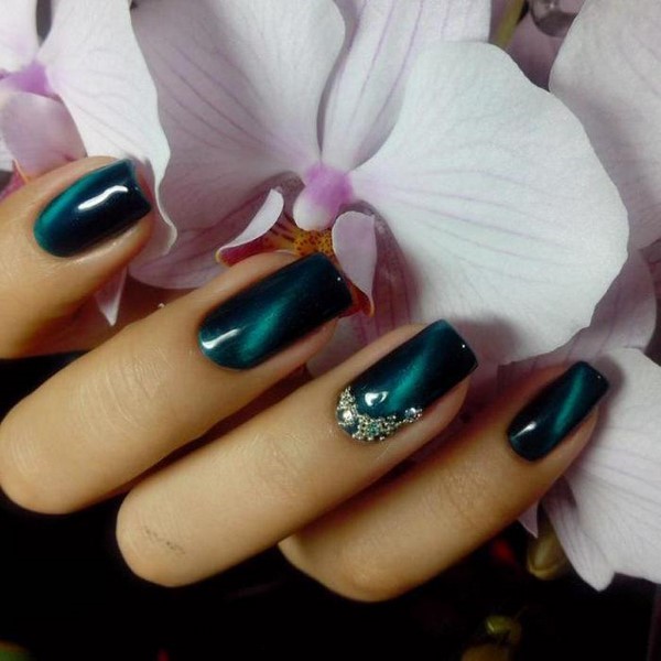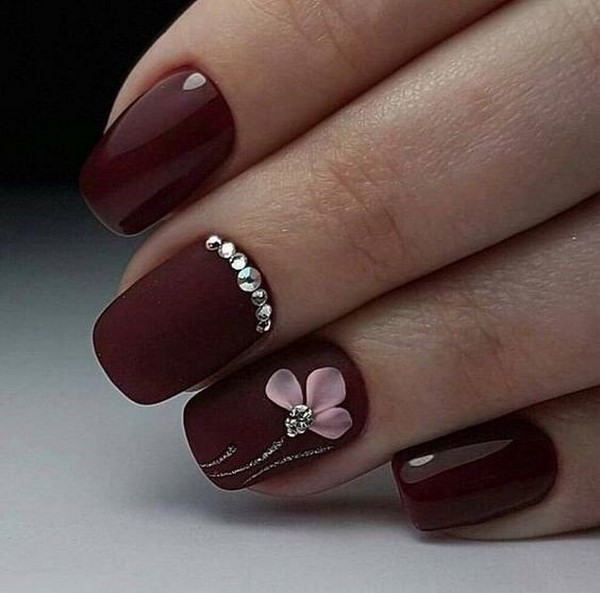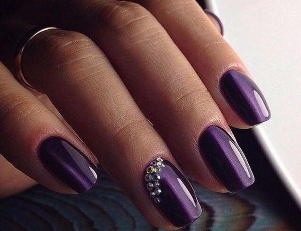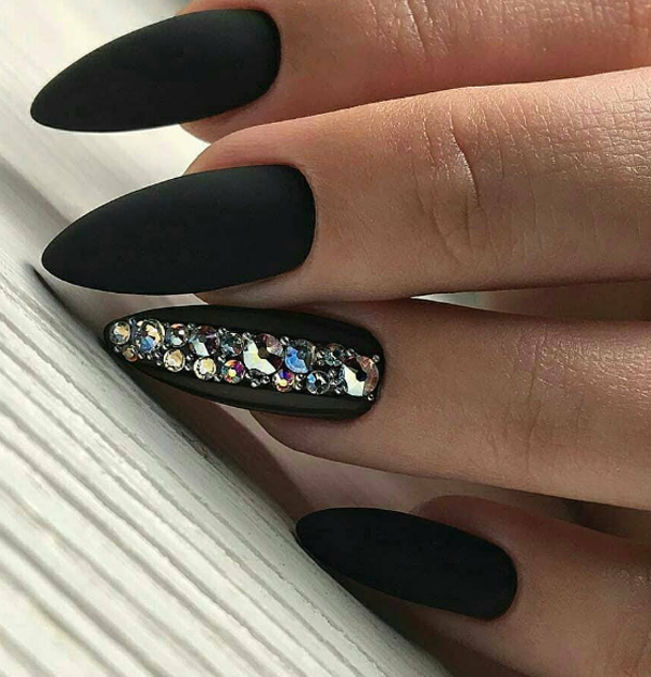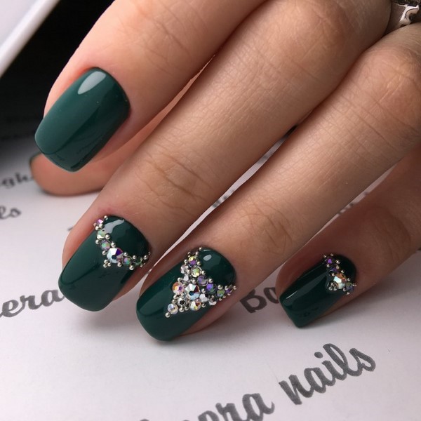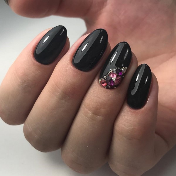 Une manucure sombre et décontractée peut être réalisée sans beaucoup de décor. Mais si vous voulez un design plus élégant, ajoutez un ombre sombre à la mode avec des strass de différentes nuances et tailles que vous rencontrerez dans les idées de photo de la galerie ci-dessous.
