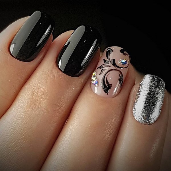 La manucure noire la plus en vogue dans une version mate peut toujours être réalisée avec de magnifiques strass et perles, ainsi que des nuances contrastées - beige clair, crème, gris, qui vous permettront ensemble de créer un étonnant nail art sombre, comme indiqué dans les exemples de photos et dans la galerie.