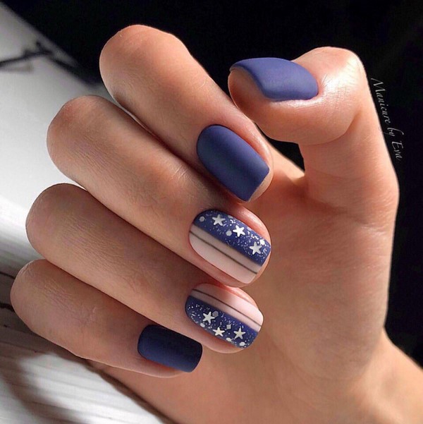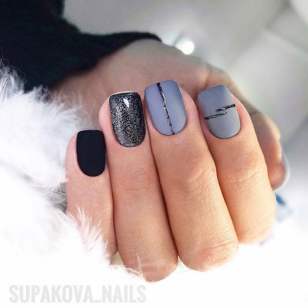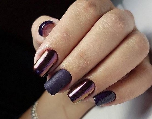 Complétez ces clous avec des dessins dans le style de la géométrie ou des bandes d’aluminium, des bandes de poudre, créez plusieurs ongles mats, une veste brillante mate sombre ou un motif dégradé d’ongles sombres pour chaque jour est idéal.