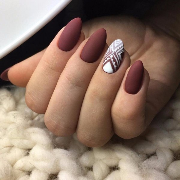 Il est donc à la mode de réaliser chaque jour une manucure sombre avec une image sobre de fleurs, des dessins de la lune, un verre de vin sur des ongles bordeaux de couleur mate, des zigzags et une géométrie.