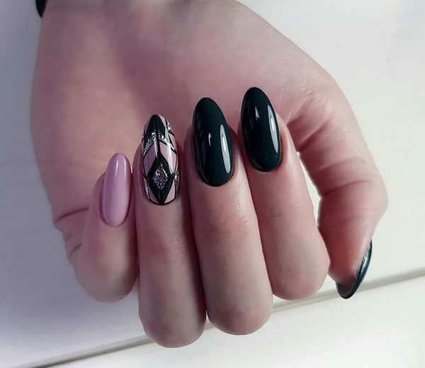 Mais vous rencontrerez aussi une belle manucure sombre avec des losanges, à la verticale et une ombre diagonale, qui ne laissera indifférent aucun admirateur de tout ce qui est beau et charmant.