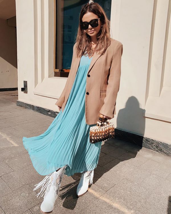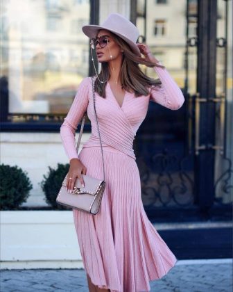 De beaux plis dans le style de tous les plis orneront également les robes à la mode de cette saison, pour tous les jours et pour la célébration. Un nouveau style plissé dans les robes à la mode 2025-2026 est proposé en tant qu'insert séparé sur les côtés de la tenue, sur la poitrine ou dans les robes courtes en forme de A Une robe à plis tendance a l’air très douce et délicate, même en combinaison avec des bottes basses de cow-boy ou des bottines.