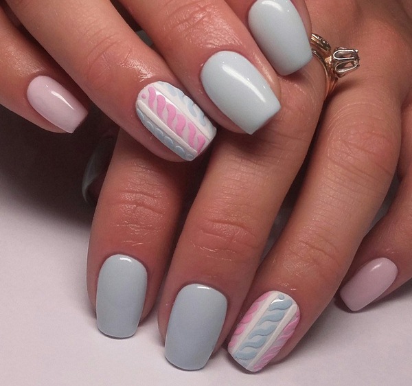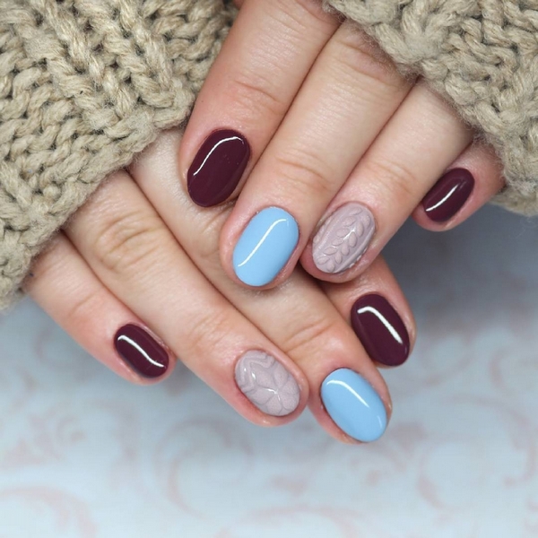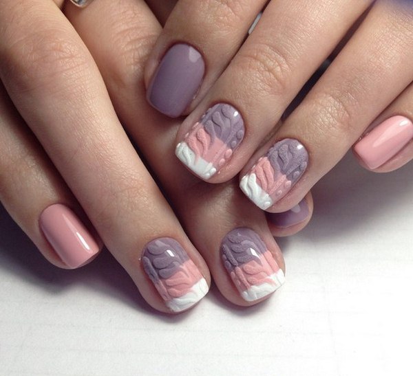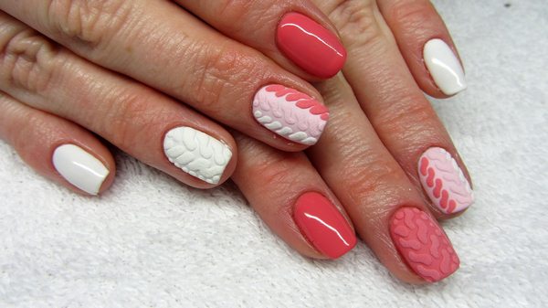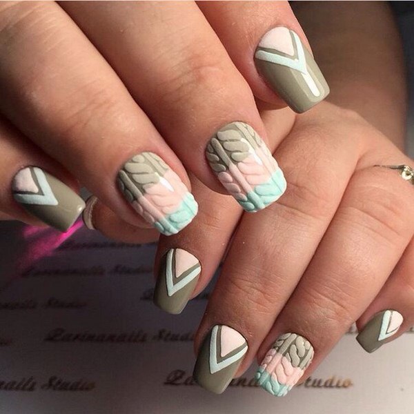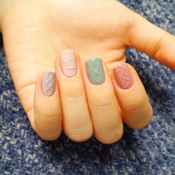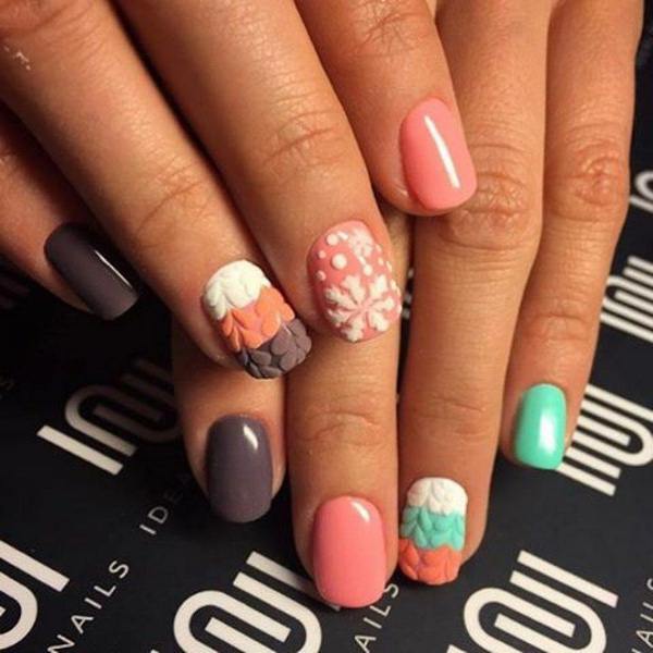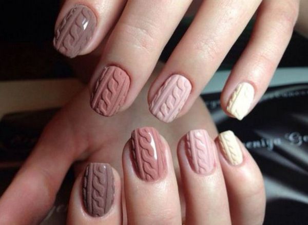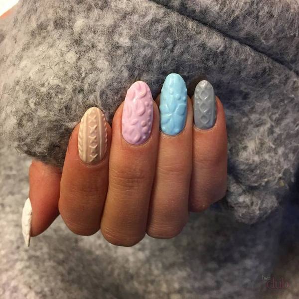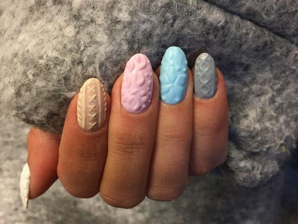 L’un des types les plus populaires de manucure tricotée est l’utilisation de plusieurs teintes proches dans une manucure. Par exemple, vous pouvez utiliser des vernis gel rose, pêche, bleu, beige, turquoise sur des ongles individuels, en réalisant des motifs amusants.
