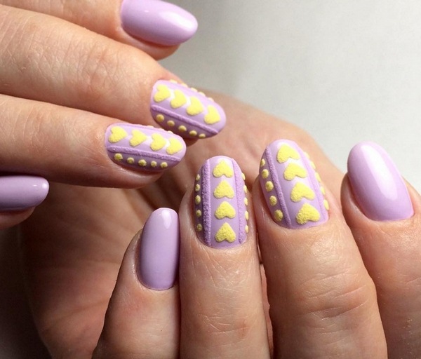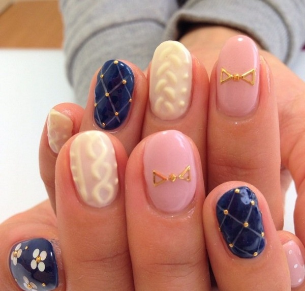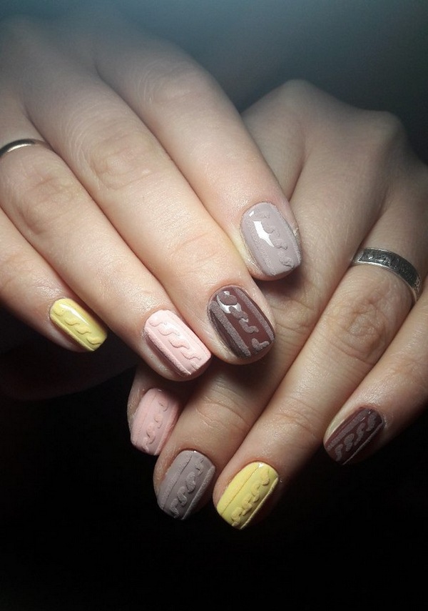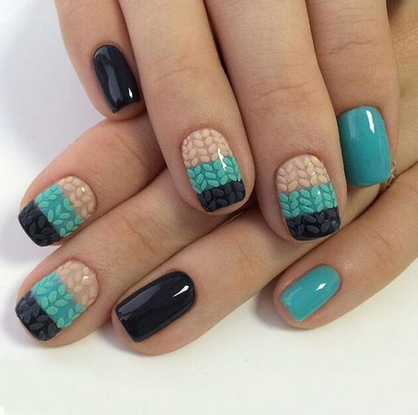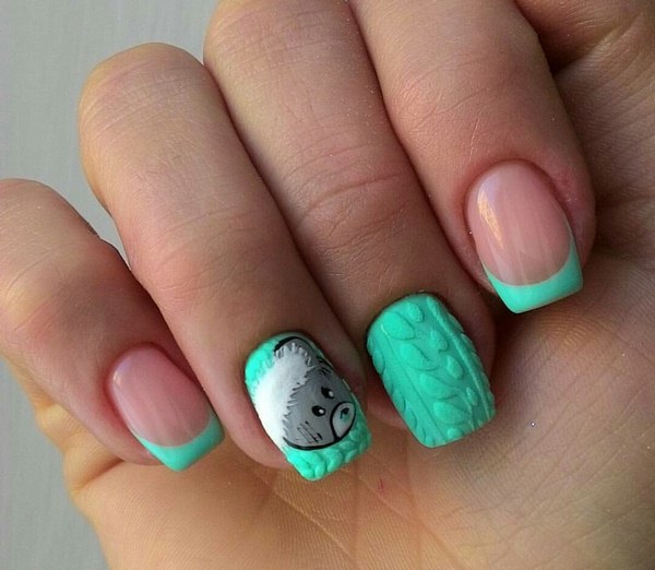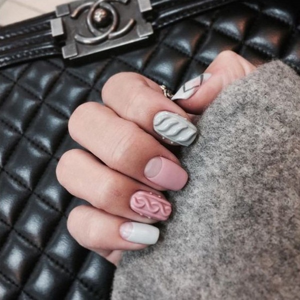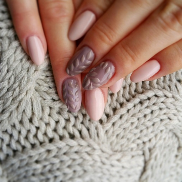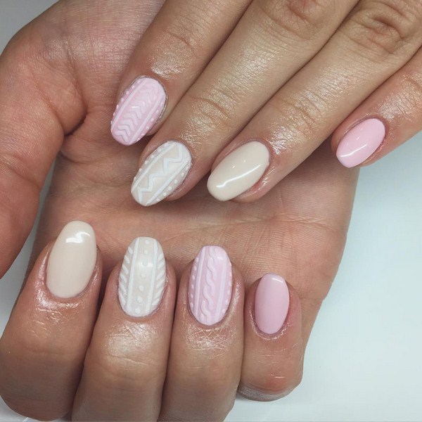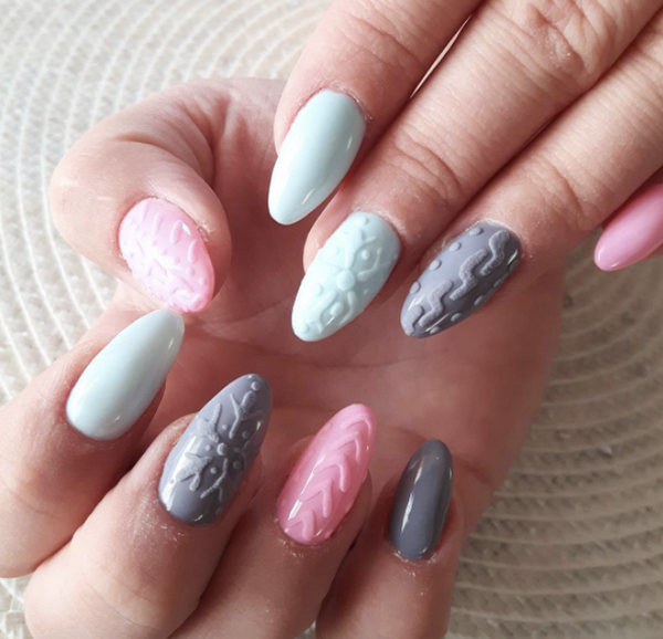 L’un des types les plus populaires de manucure tricotée est l’utilisation de plusieurs teintes proches dans une manucure. Par exemple, vous pouvez utiliser des vernis gel rose, pêche, bleu, beige, turquoise sur des ongles individuels, en réalisant des motifs amusants.