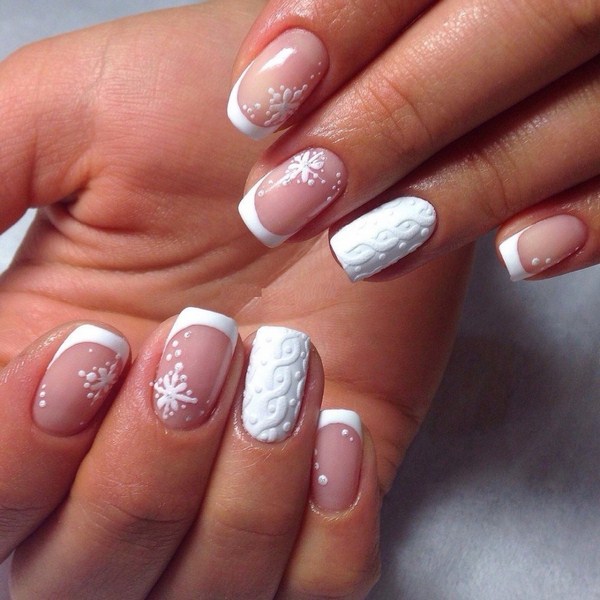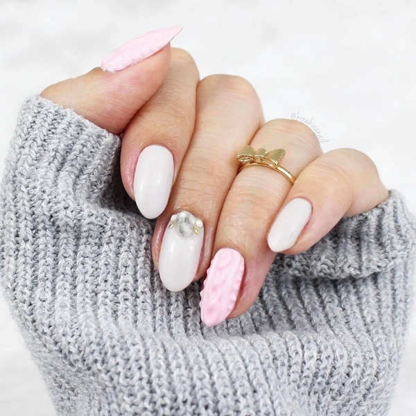 En outre, une douce manucure tricotée dans des tons pastel et nude peut être magnifiquement complétée par une perle, un strassik ou un caillou net, ou vous pouvez effectuer une manucure avec des impressions et compléter un ou plusieurs doigts avec un motif tricoté.