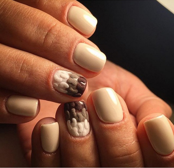 Ensuite, nous recouvrons les ongles avec la nuance choisie du gel vernis en deux couches. Après le séchage, vous pouvez commencer à créer un pull tricoté directement avec des ongles: prenez un pinceau fin pour la manucure et tracez votre motif de tissage préféré.