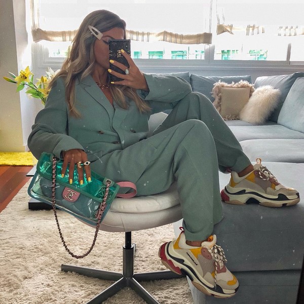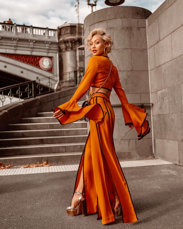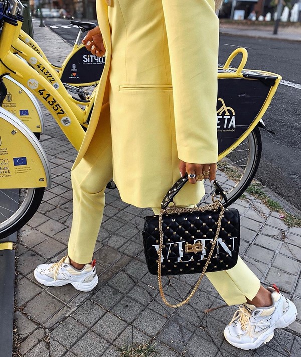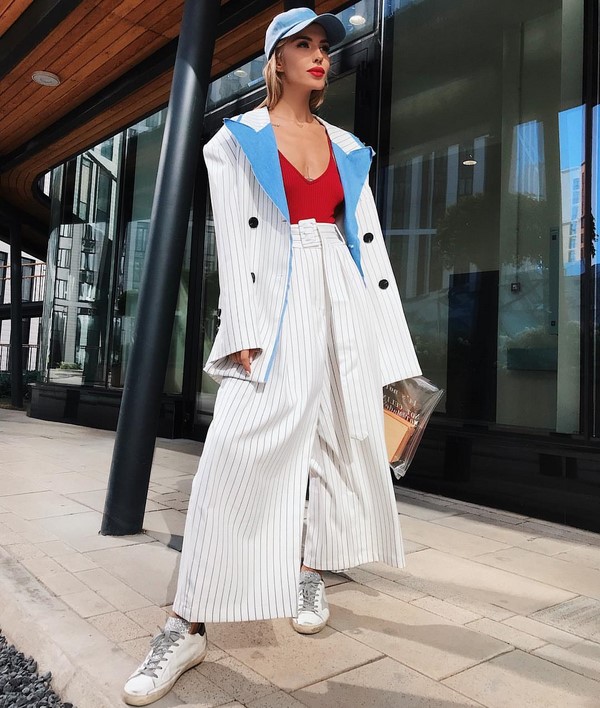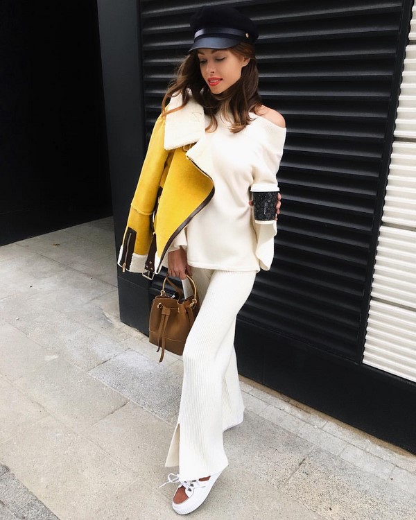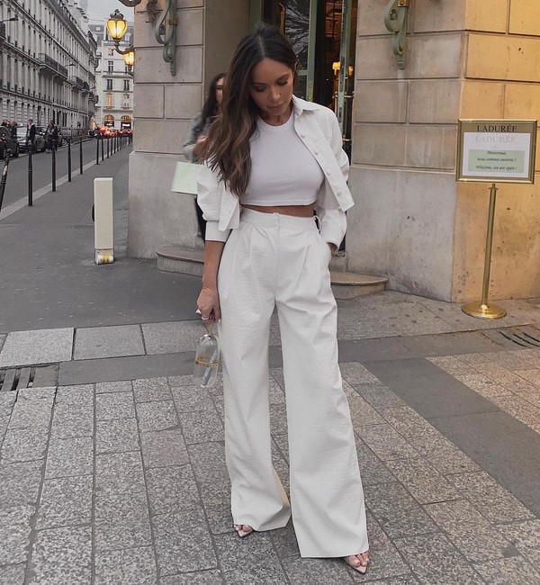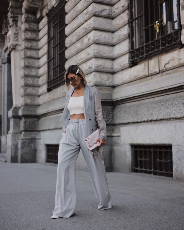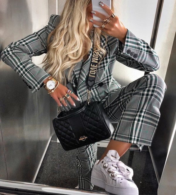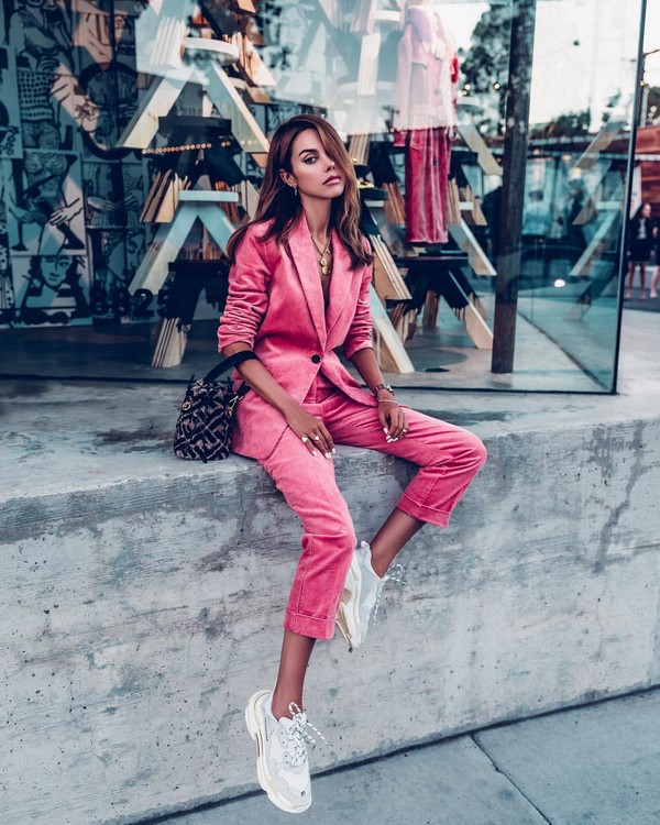 Aujourd'hui, l'imbrication de différents styles est telle qu'il est impossible de tracer une ligne de démarcation claire entre le style professionnel et le style sportif, car de nombreux survêtements comportent des éléments de décoration rigoureux et sont associés à des chaussures à talons hauts. Les tailleurs-pantalons professionnels sont proposés avec des rayures et des baskets de sport ou des bottes grossières. À cet égard, nous vous proposons un style plus sportif de tailleur-pantalon à la mode avec un pantalon évasé et un sweat-shirt léger en guise de haut, idéal pour un week-end et des promenades.