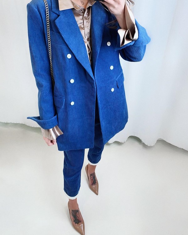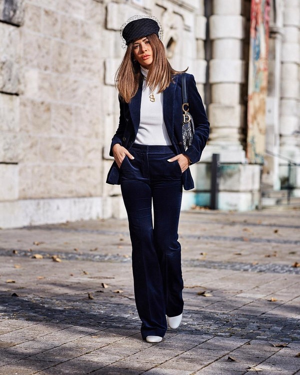 Un style idéal et noble d'un costume de pantalon 2025-2026 pour l'automne et l'hiver sera un modèle de velours ou de velours. Les nuances foncées de bleu et de bordeaux, de vin et d'émeraude ont fière allure dans cette texture, donnant un chic spécial aux images avec un tailleur-pantalon.